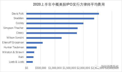 2020年上半年IPO收费最高的律所为UCloudLinkGroup (NASDAQ: UCL)IPO的律所Skadden,收费达347万美元。o Inc. (NASDAQ: ZCMD)IPO的律所Hunter Taubman收费最低,为25万美元。除两家公司(ZhongchaoInc. 和China Liberal Education Holding(NASDAQ: CLEU)外,其余14家发行方律师费用均超过100万美元。下图是律所收费的平均值: