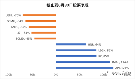 26家新上市公司中仅有13家公司在截止到2020年6月30日的股票价格不低于其IPO发行价。上周五刚刚上市的声网以高于发行价153%的涨幅领跑所有26家公司。紧随其后的是天境生物,涨幅达114%。其他涨幅前五名的公司包括金山云(85%),传奇生物(85%),和燃石医学(64%)。而相对于其IPO发行价跌幅前五的是通过SPAC合并上市的狮子集团(NASDAQ:LGHL), 耀世星辉传媒(NASDAQ: GSMG),安派科(NASDAQ: ANPC),荔枝,和众巢医学(NASDAQ: ZCMD)。