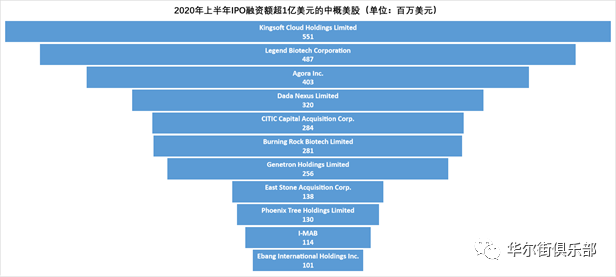 通过传统IPO上市的16家公司共计融资28.4亿美元,其中融资额低于3,000万美元的有4家,融资额在3,000万至1亿美元的有3家,融资额在1亿至2亿美元的有3家,融资额超过2亿美元的有6家。金山云(NASDAQ: KC)于2020年5月8日上市,融资额5.5亿美元,是今年上半年规模最大的IPO。紧随其后的是传奇生物 (NASDAQ: LEGN) (4.9亿美元),声网(NASDAQ:API)(4.0亿美元),达达集团(NASDAQ: DADA ) (3.2亿美元),以及燃石医学(NASDAQ: BNR)(2.8亿美元)。这5家的融资额占今年上年中概美股总融资额的近六成(58%)。