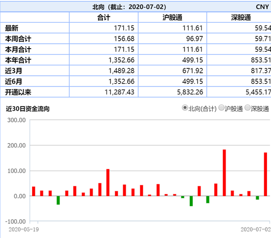 新浪港股讯 7月3日消息,上证指数收涨2%,本周涨近6%,创出近15个月新高;券商股再掀涨停潮。两市成交额连续两日突破万亿。北向资金疯狂涌入132亿元,两日流入额超300亿元。沪股通净流入80亿,深股通净流入52亿元。