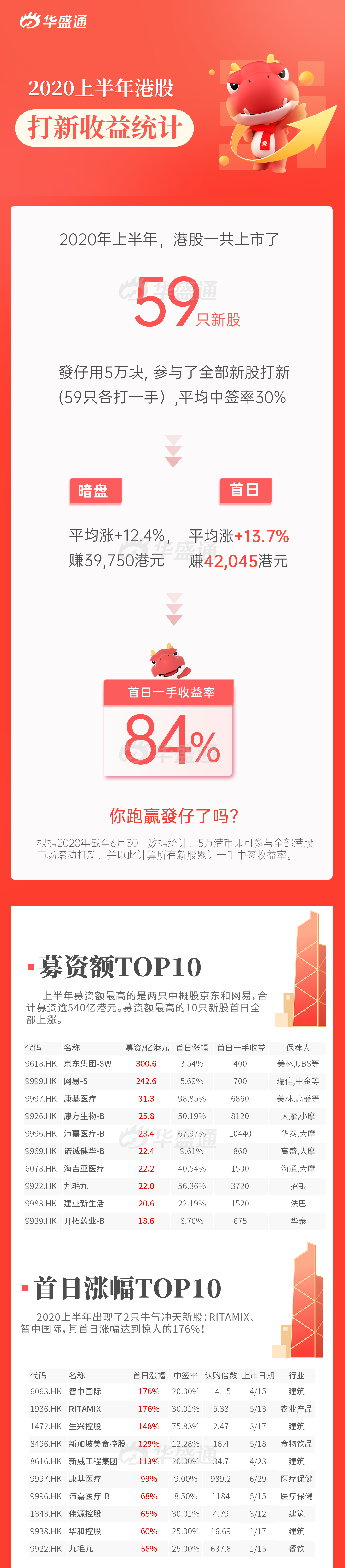 2020上半年,港股市场迎来59宗IPO(首发上市),合计募资约854.77亿港元。京东、网易位居募资额Top2,共计募资540亿港元,占总募资额63.17%。