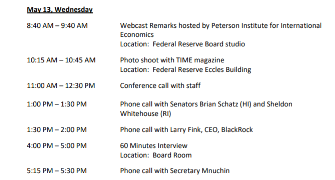 日历还显示,鲍威尔连续第三个月与全球最大资产管理公司贝莱德的CEO拉里·芬克(Larry Fink)谈话,美联储已聘请贝莱德就美联储的一些紧急工具提供咨询意见。5月13日,鲍威尔与拉里·芬克通了半个小时的电话。