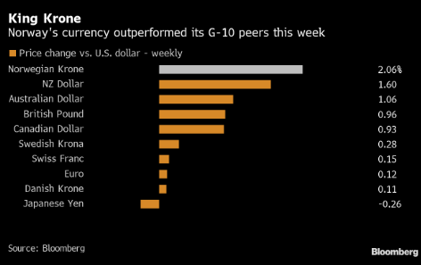 挪威克朗兑美元周涨幅约为2%,同期美元兑G-10货币多数下跌。伦敦时间周五13:52,挪威克朗兑美元报9.5085。周四达到过9.4375的6月11日以来最强水平。彭博美元即期指数有望录得一个月来首个周跌幅。