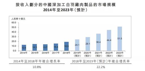 据其在招股书中预测,未来公司主要出口国家的整体出口量将呈现出连年递增的趋势,预计2018年至2023年中国肉鸡出口量将进一步以5.1%的年复合增长率增长。