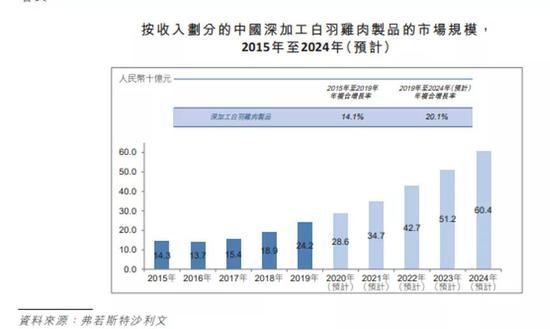 根据弗若斯特沙利文报告,我国鸡肉产量和消费量将在2019年至2024年间分别以6.5%、7.0%的年复合增长率增长,并在2024年达到10.4百万吨、10.8百万吨。