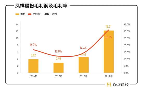 同时期,节点财经注意到,凤祥股份的毛利率提升明显。毛利从2016年的3.92亿元增加至2019年12.21亿元,毛利率从16.7%拔高到31.1%,近乎翻倍。