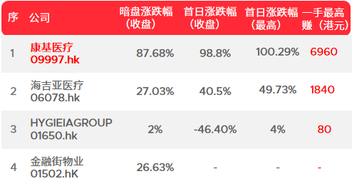 周一,康基医疗首日上市暴涨98.85%,一手赚6860港元,挂牌后连涨3天,至今累涨112.5%,最新市值369.4亿港元。海吉亚首日最高涨49.7%,一手赚1840港元,挂牌后连涨4天,累涨55.67%,最新市值172.8亿港元。周五,金融街物业在暗盘交易中大涨26.63%,一手赚1960港元。