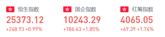 周五恒生指数开盘涨0.78%,午后曾涨超300点,尾盘涨幅收窄。全天呈窄幅震荡走势。截至收盘,恒生指数涨248.93点或0.99%,报25373.12点,全日成交额达1639.51亿。国企指数涨1.85%,报10243.29点,红筹指数涨1.74%,报4065.05点。