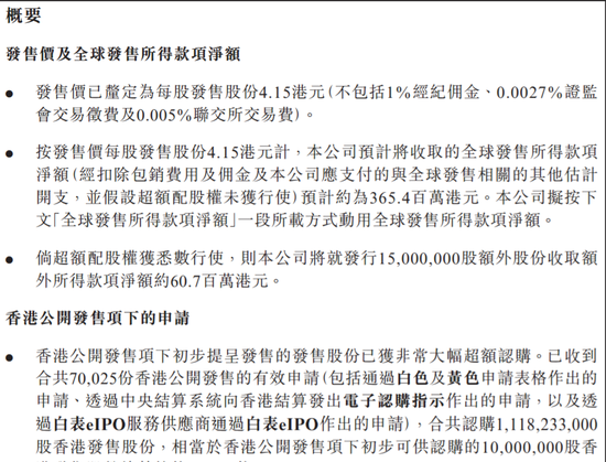 国际发售项下初步提呈发售的发售股份已获大幅超额认购,超额认购数目为国际发售项下初步可供认购发售股份总数的约15.0倍,且国际发售已超额分配1500万股股份。国际发售项下的发售股份最终数目为5000万股,相当于全球发售项下初步可供认购的发售股份总数的50%(超额配股权获行使前)。