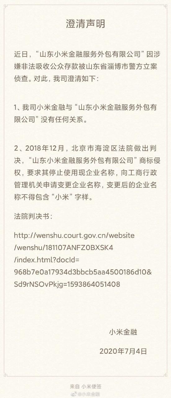 新浪港股讯 7月6日消息,小米金融官微昨日发布声明称,近日“山东小米金融服务外包有限公司”因涉嫌非法吸收公众存款被山东省淄博市警方立案侦查,小米金融与该公司没有任何关系。