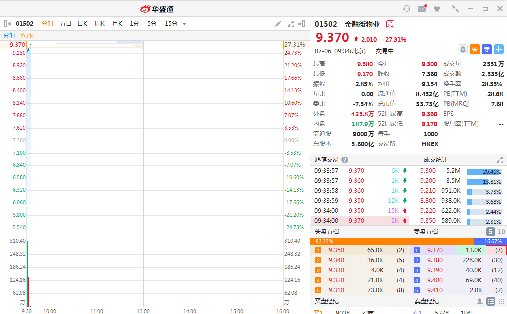 华盛资讯7月6日讯,金融街物业(01502)今日首挂,开盘大涨25.41%,一手账面盈利2010港元。