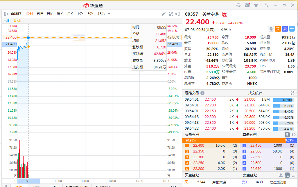 新浪港股讯 7月6日消息,美兰空港有望提升为国际中转枢纽机场,股价大涨42.86%,报22.40港元。