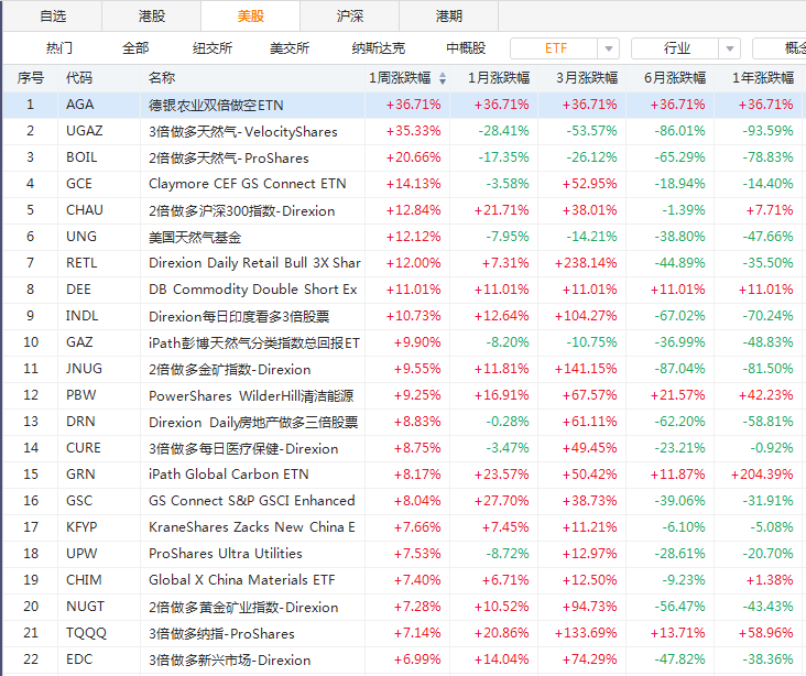 上周涨幅较高的做多ETF大致可以分为:天然气、A股沪深300指数、印度股指和美股的多个指数(忽略AGA,该ETF停牌已久)。