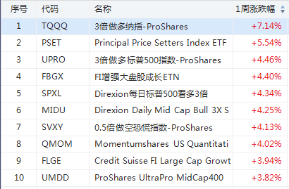 由于上周纳指再创新高,3倍做多纳指的TQQQ领涨其他ETF,涨幅达到7.14%,相比之下,做多标普500指数的ETF涨幅便较为落后了。