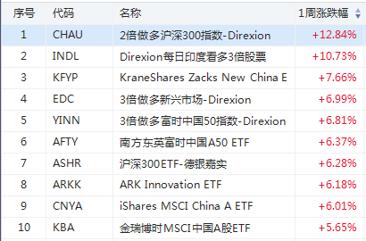 在其他区域类ETF中,上周全球表现最佳的是沪深300指数,2倍做多沪深300的CHAU涨幅达到12.84%。