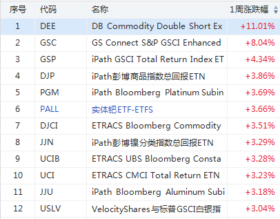 商品ETF中,涨幅排名第一的仍然是GSC,一只多元持仓的商品ETF。而投资钯金的PALL也以近4%的涨幅位列第5(钯是铂族元素之一,也是世界上最稀有的贵金属之一,外观与铂金相似)。(DEE停牌已久,涨幅为历史行情)