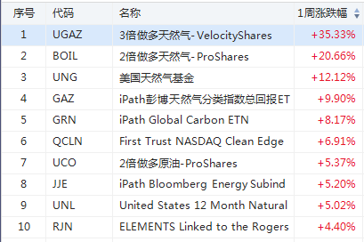 截至上周四,按最活跃合约计算, WTI期货一周上涨5%,布油期货上涨5.2%。但表现更佳的是前一周表现最差的天然气,2倍做多天然气的UGAZ一周涨幅达到35.33%,位列能源ETF涨幅榜首位。