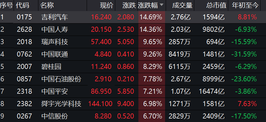 吉利汽车涨15%,中国人寿涨14%,瑞声科技涨10%,中国联通涨9%,碧桂园涨8%。