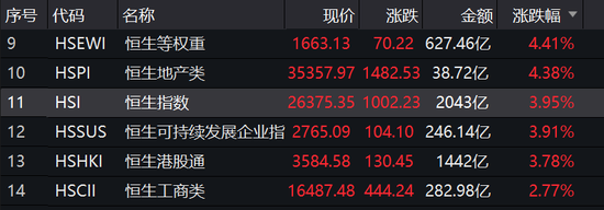 新浪港股讯 7月6日消息,港股午后涨幅扩大,恒指涨幅扩大至4%,暴涨1000点,报26375点。科技、消费、医药、地产集体暴涨。