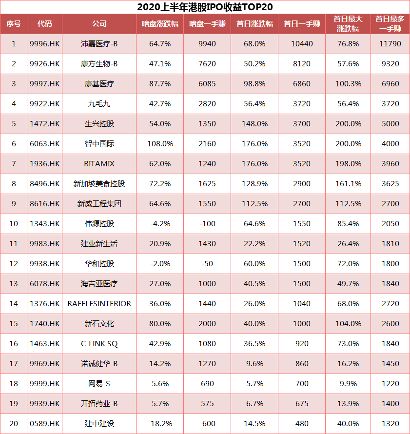 投资者们积极打新,最为关注的自然是收益。2020上半年港股市场首日卖出一手收益最高的是沛嘉医疗-B,首日涨幅达68%,一手可赚10440港元。