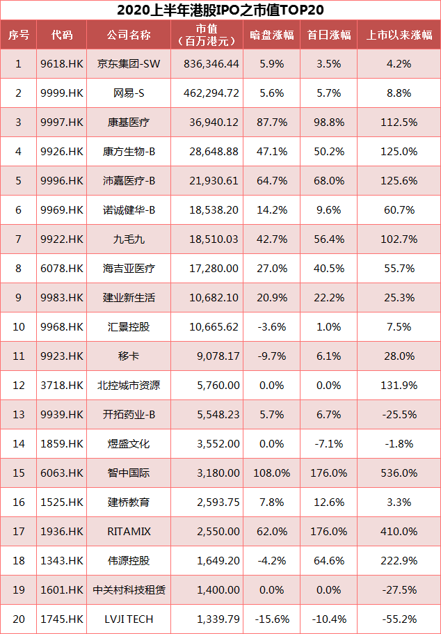 按照2020年7月3日收市市值排序,赴港二次上市的电商巨头公司京东,以8363.5亿港元荣登2020上半年港股IPO市值榜首。