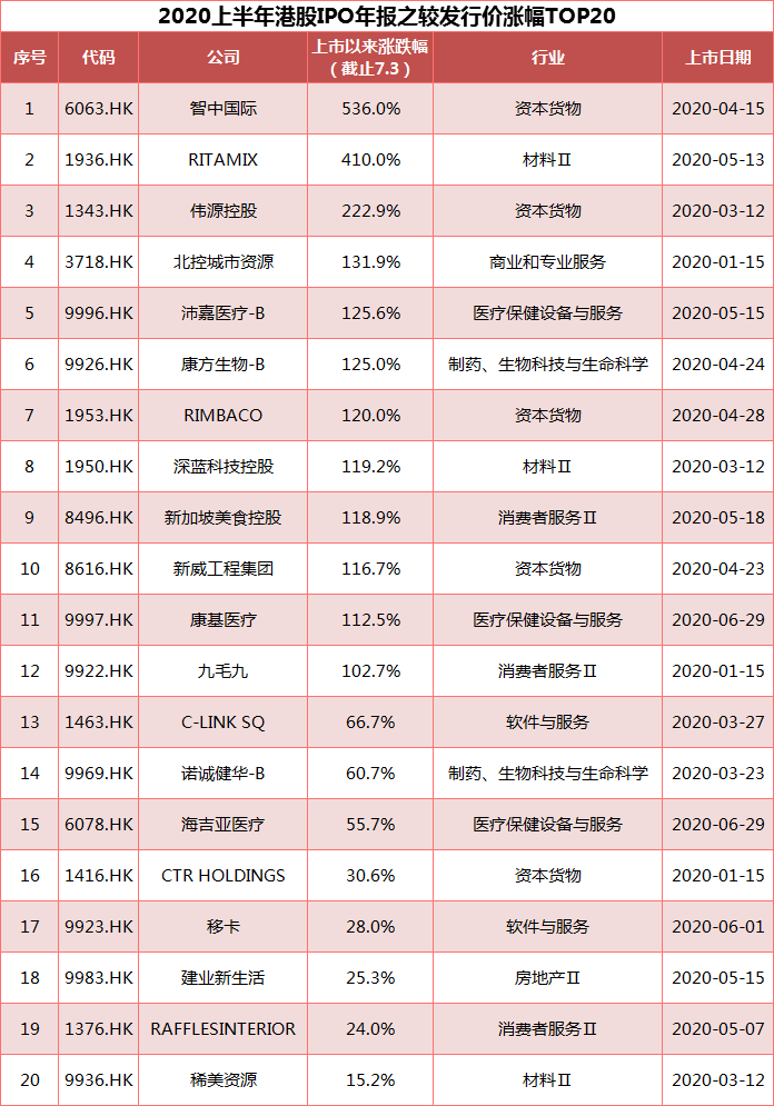 而北控城市能源、智中国际、RITAMIX、伟源控股这部分市值在百亿以下的公司也实现了上市至今较发行价的翻倍表现,其涨幅分别为131.9%、536%、410%、222.9%。