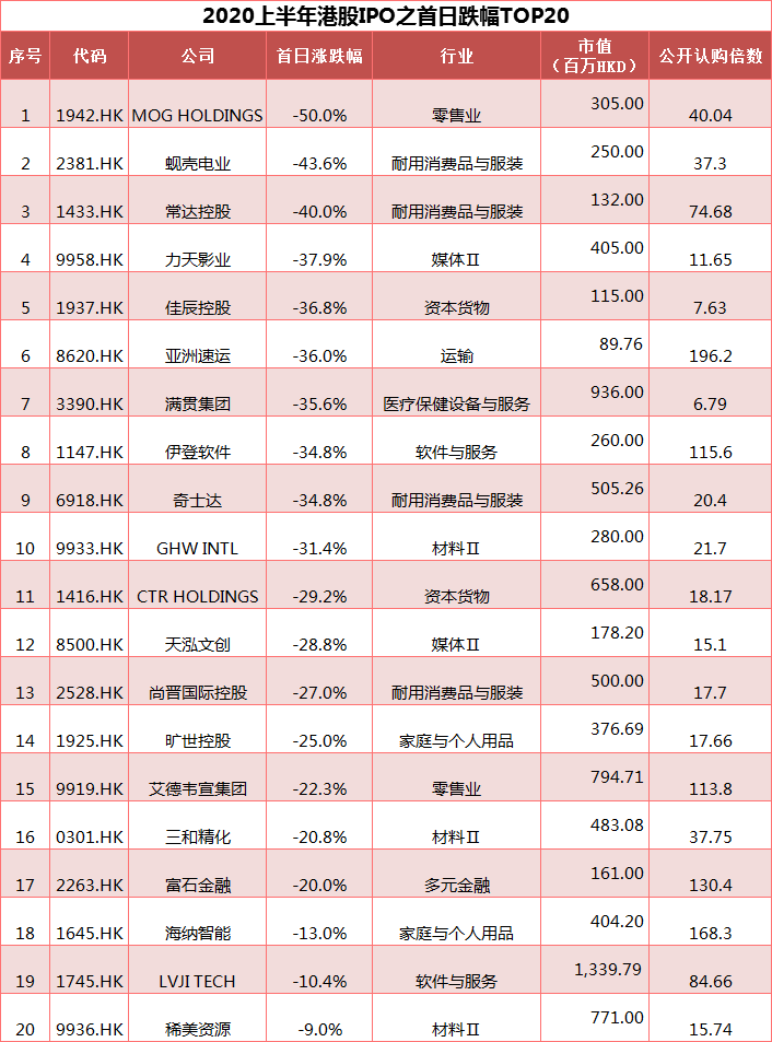虽然在2020上半年不乏强势牛股,但还是有一部分股票会成为打新投资者的心头之痛。在2020上半年港股新股上市首日跌幅榜中,来自马来西亚第二大光学产品零售商MOG HOLDINGS就以50%跌幅荣膺最惨宝座。