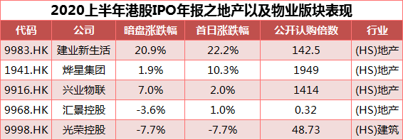 而观察2020年上半年的地产和物业管理板块,可以看到如建业新生活、烨星集团、兴业物联等物业股明显表现强于地产和建筑股。