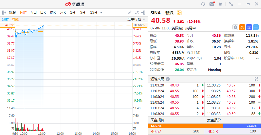 华盛资讯7月6日消息,受新浪私有化消息刺激,微博、新浪携手大涨,截至北京时间23:03,微博涨幅扩大至近18%,报39.7美元。