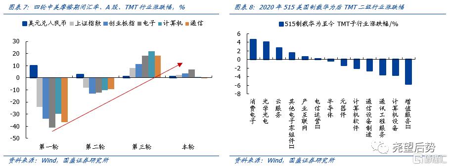 3、对A股杀伤力趋弱。第一轮股汇双杀,大盘与创业板下跌24%和34%,人民币贬值10%。第二轮冲击股市,大盘与创业板下跌8%和13%,人民币小幅贬值3%。第三轮A股开启免疫,大盘与创业板反而上涨8%和11%。本轮A股免疫,小幅冲击通信板块,电子及计算机未受影响。