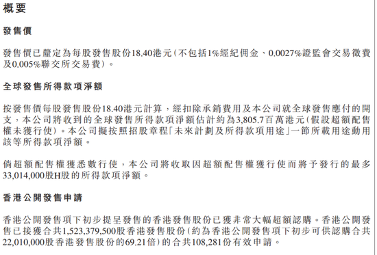 香港公开发售股份已获非常大幅超额认购,已接获合共约15.23亿股香港发售股份(约为香港公开发售项下初步可供认购合共2201万股香港发售股份的69.21倍)的合共108,281份有效申请。