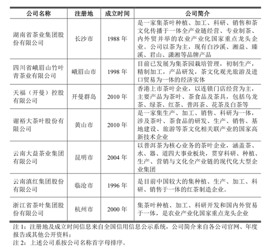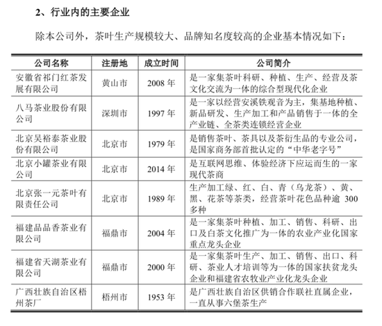 中茶股份的招股书预披露文件显示,2019年,按销量计算,该公司在不同茶类的市占率分别为:黑茶1.15%,乌龙茶1.74%,红茶1.67% ,白茶0.77% 。其主要竞争对手包括祁门红茶、小罐茶、大益茶等。