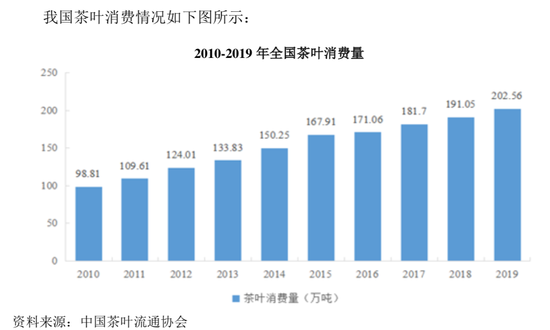 近年来,中国茶叶消费量持续增长。根据中国茶叶流通协会统计,2019年,国内茶叶年消费量达到202.56万吨,较前一年增长11.50万吨,增幅为6.02%;国内市场销售额达到2739.50亿元,销售均价为135.25元/公斤。