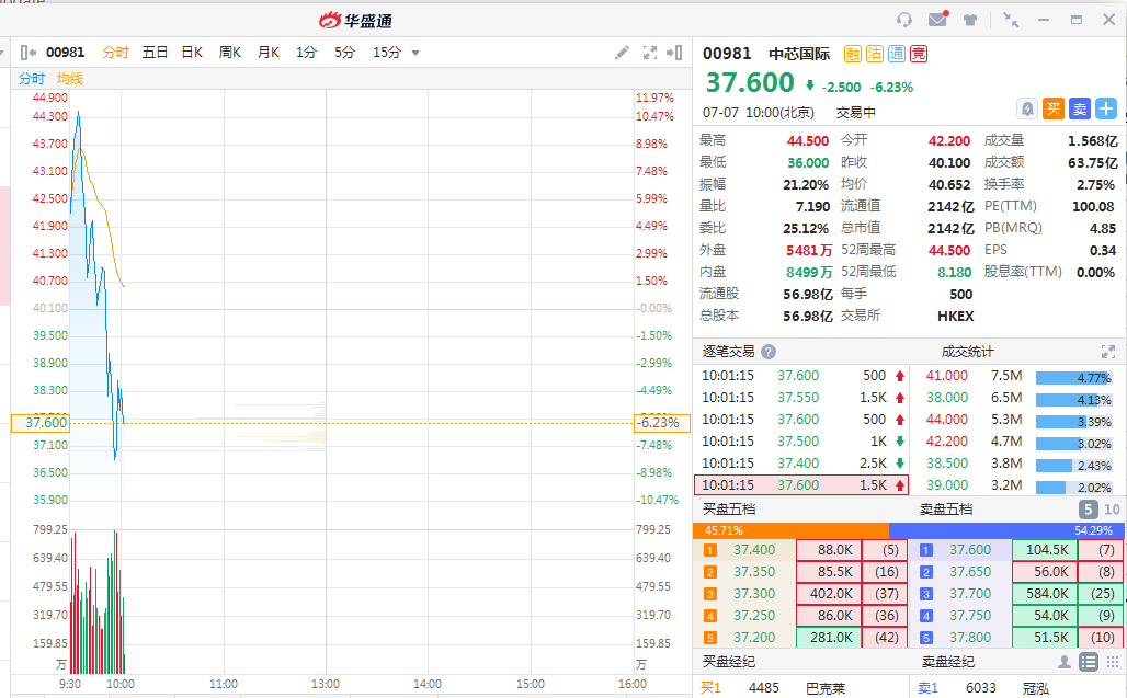 新浪港股讯 7月7日消息,中芯国际跳水跌6%,此前一度涨超10%。