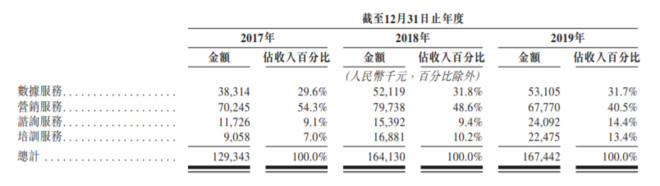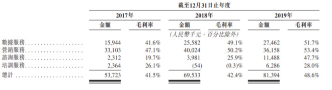 其中数据服务、营销服务、咨询服务毛利较高,约50%左右。