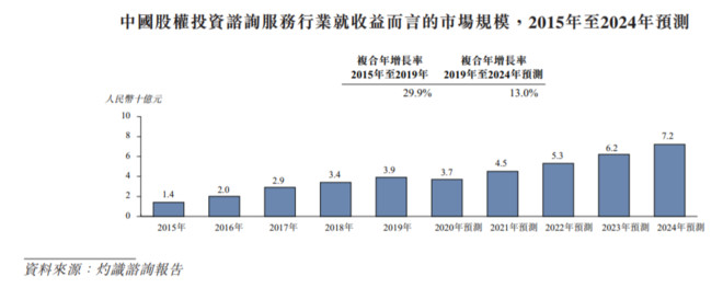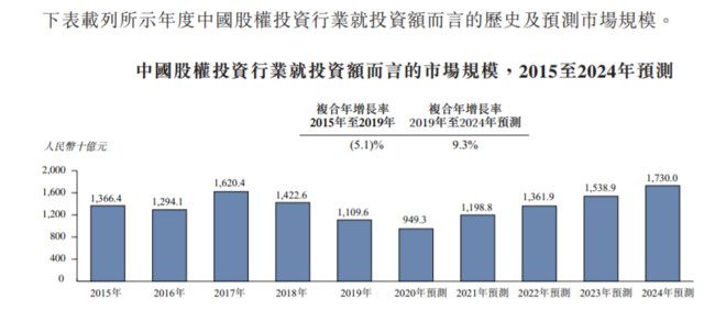 2.行业:中国股权投资行业市场规模在过去五年经历了波动,由2015年的人民币13,664亿元减少至2019年的人民币11,096亿元,复合年增长率为-5.1%。预计行业于2021年复苏,且市场规模预期将自2019年至2024年以9.3%的复合年增长率增长至2024年的人民币17,300亿元。