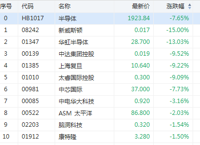 智通财经APP获悉,半导体板块尾盘随A股走弱。截至15时16分,华虹半导体(01347)跌13.03%,报价28.7港元,中芯国际(00981)跌7.73%,报37港元。