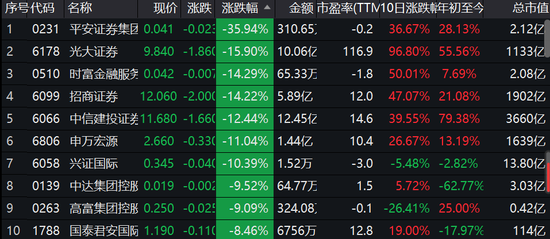 券商股集体砸盘,平安证券集团跌36%,光大证券跌16%,招商证券跌14%,中信建投跌12%,申万宏源跌11%。