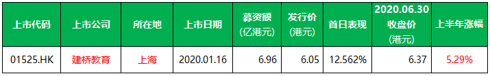 2020年上半年在香港上市的内地教育企业仅一家建桥教育(01525.HK),募资6.96亿港元;首日上市表现不错,涨幅12.56%;就2020年上半年来看,股价下跌6.46%。