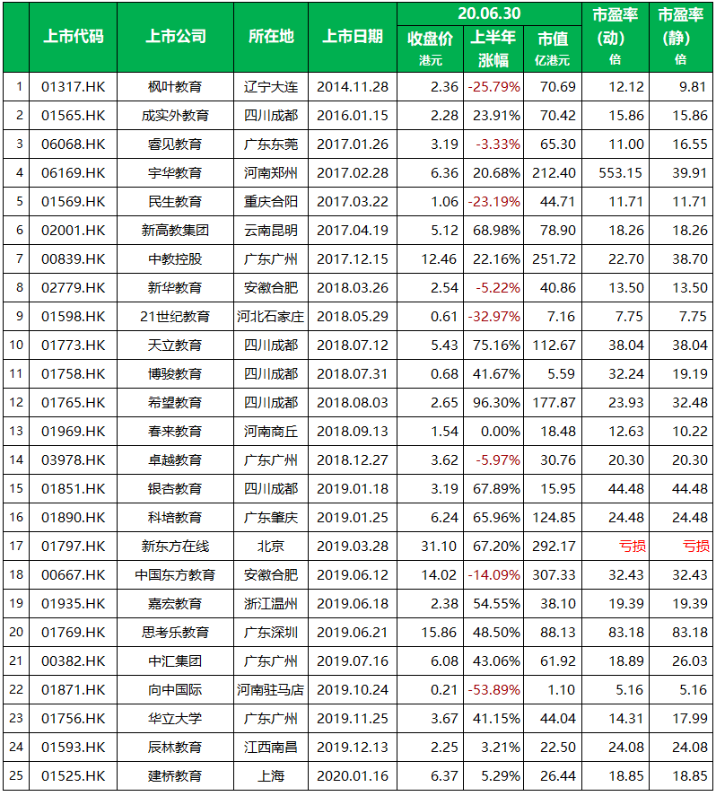 截止至2020年6月30日,在香港上市的教育企业已达 25 家,全部为主板上市公司。