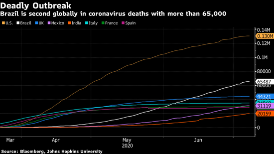 巴西已成为全球核心新冠疫区,有超过65,000例确诊死亡病例和总计超过162万确诊病例,严重程度仅次于美国。该国对疫情应对混乱,总统经常与州长乃至卫生部长就隔离措施和潜在疗法发生冲突。在博索纳罗解雇他任内的第一个卫生部长,第二任又辞职后,巴西卫生部目前由临时负责人领导。
