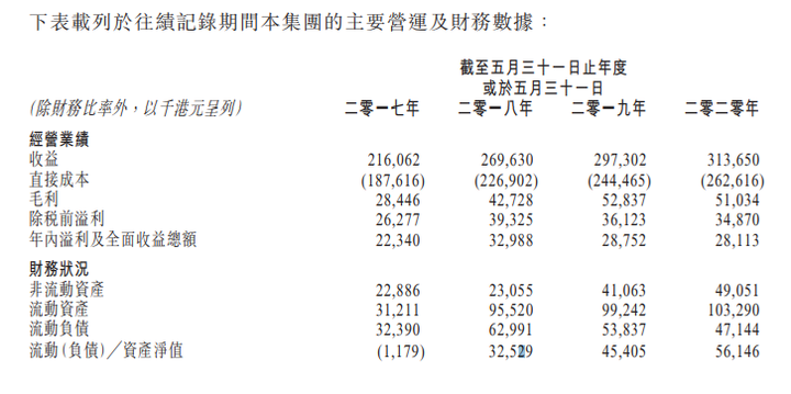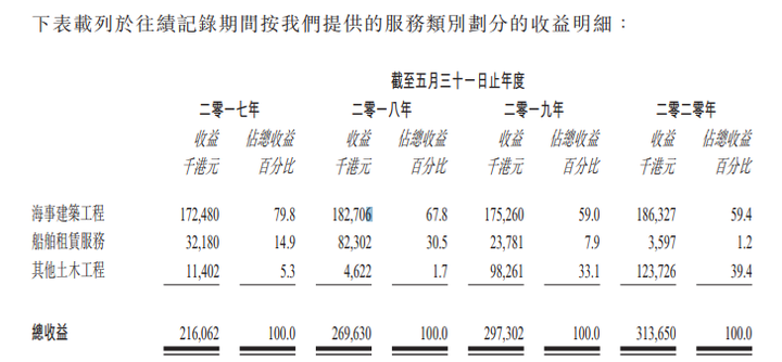 于往绩记录期间及直至最后实际可行日期,公司已完成 22个海事建筑或其他土木工程项目,总初始合约金额约为5.94亿港元。于最后实际可行日期,公司有10个在建海事建筑或其他土木工程项目及五个尚未动工的海事建筑或其他土木工程项目,总初始合约金额约为2.8亿港元。