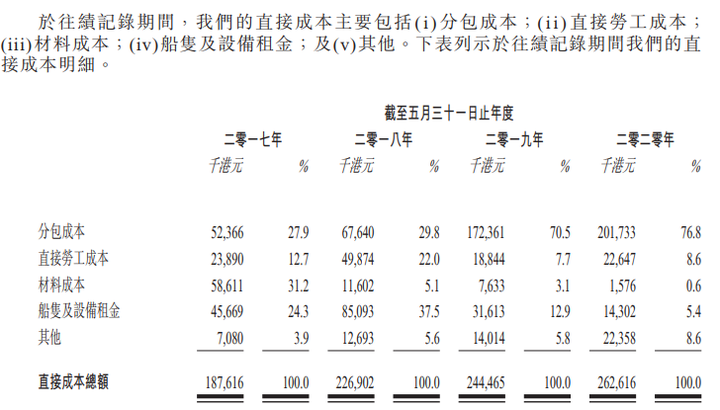 此外,裕勤控股业绩还深受成本端——分包成本的影响。裕勤控股由于人员有限,生产过程需要需要分包商来完成,招股书显示,从2017年-2019年,公司分包成本高达7128.9万港元,占直接成本总额79.8%,上升趋势非常快。由此看来,公司的利润因为成本端的不可控而受拖累,近几年的净利润率在10%左右,并不算高。