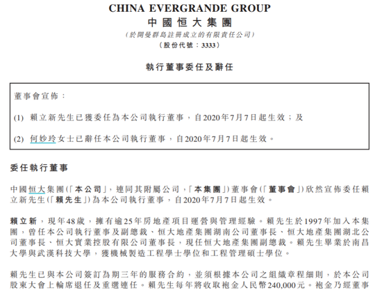 新浪港股讯 7月7日晚间,中国恒大对外发布公告称,何妙玲辞任执行董事,同日赖立新获委任接任该职。在何妙玲卸任执行董事后,仍将担任中国恒大集团副总裁。