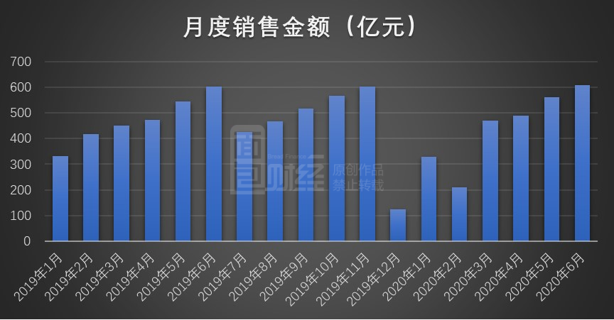 公告显示:6月份公司实现合同销售(权益口径,下同)金额609.60亿元,同比增加0.94%;实现合同销售面积729.00万平方米,同比增加9.79%。2020年1~6月累计实现合同销售金额2669.50亿元,合同销售面积3185.00万平方米。