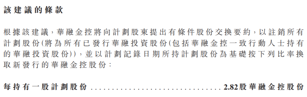 按照私有化方案,华融投资原股东持股将置换成华融金控股份。华融金控将向华融投资原股东配发51.2亿股华融金控股份,占华融金控扩大后股本的58.8%。