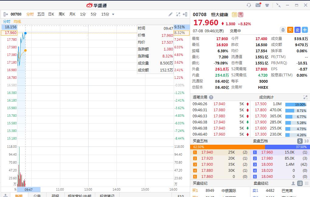恒大健康涨超8%市值突破1500亿港元 本月以来已累涨超70%