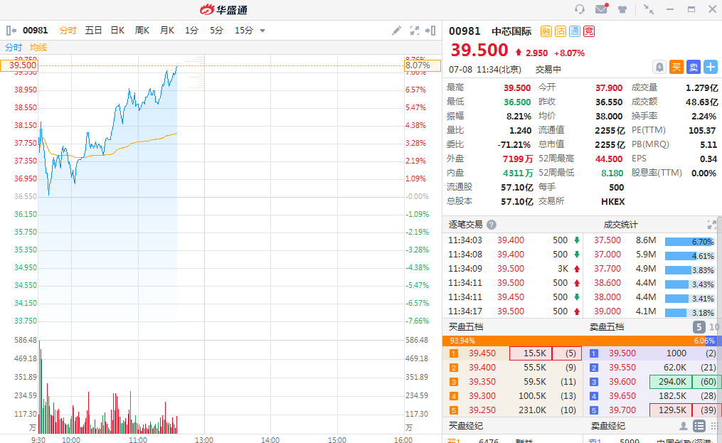 智通财经APP获悉,中芯国际(00981)科创板IPO获566倍超额认购。中芯国际此次上市的发行价格为27.46元/股,募资额达453亿元,是自2010年以来A股最大规模的IPO。受消息影响,港股中芯国际涨超8%,截至发稿,涨8.07%,报39.5港元,成交额48.63亿港元。