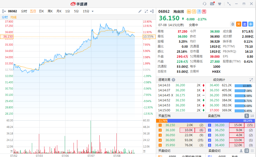 Wind数据显示,截至7月8日14:00,海底捞股价下跌1.62%,每股报价36.4港元。
