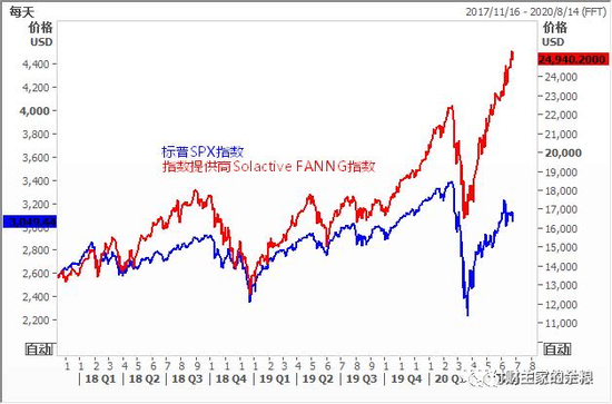 下图就是标普500指数的上涨与FANNG指数(脸书,苹果、亚马逊,奈飞,谷歌)的对比情况——显然可以看出,疫情爆发之后,股市大跌的时候,科技股跌得很少,而股市反弹的时候,科技股一路暴涨,强势创出新高。